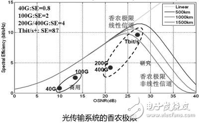 香农理论决定系统的频谱效率越高(容量越大),信号无误码传输需要的信噪比就越大,过大的信噪比会导致光传输距离大幅缩短。而且在WDM(波分复用)系统中,还有光纤信道特有的非线性效应,非线性效应通过对信号功率的限制进而限制了信噪比,进一步压缩了提升频谱效率的技术空间。