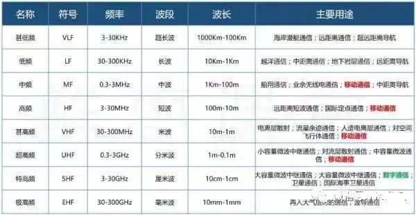 大家注意上面图中的红色字体。一直以来,我们主要是用中频~超高频进行手机通信的。。。随着1G、2G、3G、4G的发展,使用的频率是越来越高的。。。