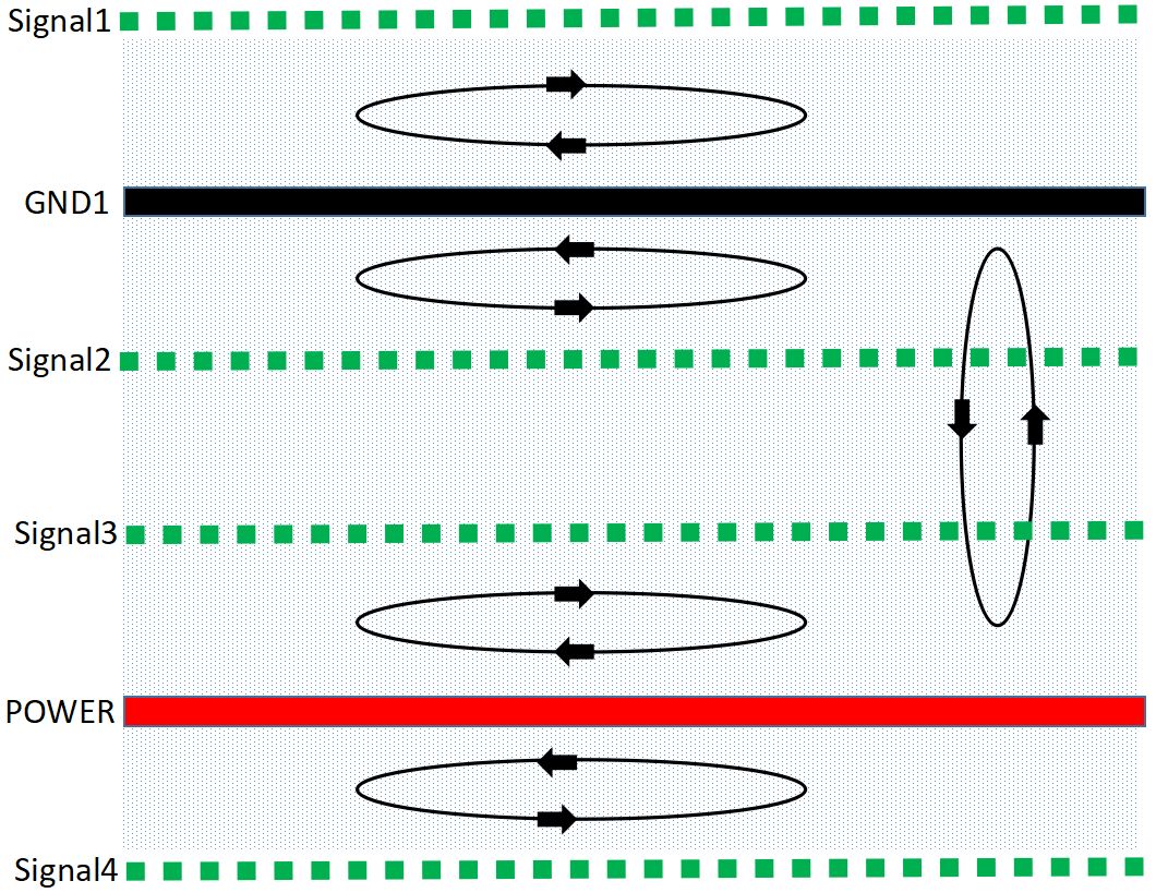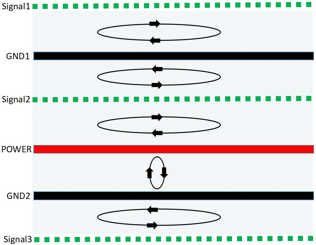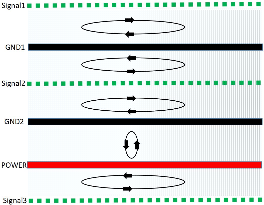 磁通对消的本质就是信号回流路径的控制,具体示意图如下: