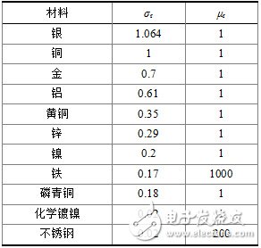 屏蔽材料的导电性能和导磁性能分别用相对电导率σr和相对磁导率μr来衡量,表1中列出了常用屏蔽材料的σr及μr值[1]。