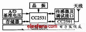根据设计要求,系统硬件结构框图如图1所示。核心芯片CC2531结合其外围电路(如晶振、A/D基准电压、存储器、传感器及调试接口等),加上必需的电源模块以及射频前端芯片CC2591,构成了本方案的硬件系统。在应用于不同的领域时,对应的传感器、电源、A/D基准电压、存储器等均可进行相应的调整。CC2531和CC2591部分的硬件设计则较为固定。