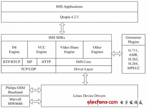 为创建本智能手机的软硬件系统平台,需要基于IMS和VCC实现原理和具体功能需求来设计系统架构,下图是基于Linux和IMS的系统架构图。