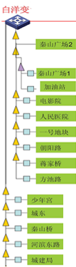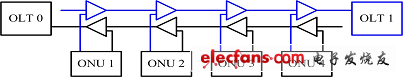 无源光网络可以很好工作于野外环境,对雷电、电磁波等干扰具有天然免疫能力;OLT放置于高压变电所机房,沿变电站敷设光缆,采用总线型接入方式,通过分光器就近接入各变电站,总线型光纤接入方案实例,如图2所示。