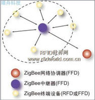 与移动通信的CDMA网或GSM网不同的是,Zigbee网络主要是为工业现场自动化控制数据传输而建立,因而,它必须具有简单,使用方便,工作可靠,价格低的特点。而移动通信网主要是为语音通信而建立,每个基站价值一般都在百万元人民币以上,而每个Zigbee“基站”却不到1000元人民币。每个Zigbee网络节点不仅本身可以作为监控对象,例如其所连接的传感器直接进行数据采集和监控,还可以自动中转别的网络节点传过来的数据资料。除此之外,每一个Zigbee网络节点(FFD)还可在自己信号覆盖的范围内,和多个不承担网络信息中转任务的孤立的子节点(RFD)无线连接。