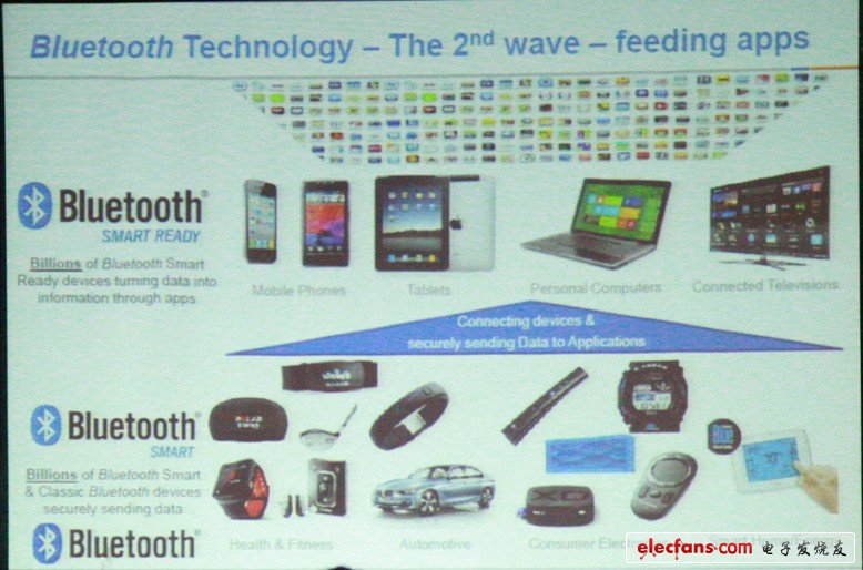 大会首先由蓝牙技术联盟的亚太区高级会员发展及关系经理周佩君发言,根据她的介绍,到2011年底,全球蓝牙模组的出货量达到了70亿。而在2012全年的蓝牙模组出货量预测会高达20亿。而随着蓝牙4.0的发展,这个数量将会迎来新的增长。在发言中还提到目前目前蓝牙的三个商标,分别是Bluetooth Smart Ready、Bluetooth Smart和Bluetooth,而前两个商标则会帮助消费者识别具有蓝牙4.0版本兼容性的新设备。Bluetooth Smart Ready设备包括手机、平板电脑、个人电脑及电视机等处于消费者互联世界核心的电子设备,可以执行蓝牙4.0版本双模无线标准;而Bluetooth Smart设备则涵盖低耗能的蓝牙4.0版本单模无线标准的设备,包括心率监测仪、计步器等使用纽扣式电池,以及用于收集特定信息的感应器类电子设备。Bluetooth Smart Ready设备不仅可与世界上数以十亿计的蓝牙设备连接,同时还可与上市的Bluetooth Smart设备连接。由于具有革命性的低耗能特性,Bluetooth Smart设备仅能与贴有Bluetooth Smart Ready标识的产品,以及由产品制造商特别指定的产品相连接。
