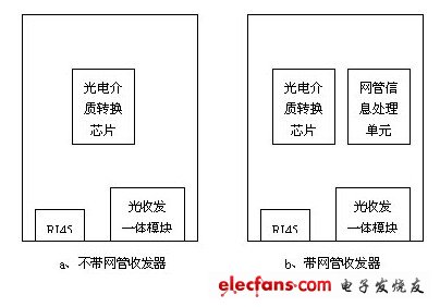光纤收发器包括三个基本功能模块:光电介质转换芯片、光信号接口(光收发一体模块)和电信号接口(RJ45),如果配备网管功能则还包括网管信息处理单元。