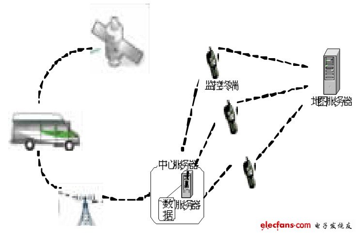 车载终端主要由GPS信号接收模块、数据处理模块和GPRS模块构成。GPS信号模块主要是接收来自定位卫星的GPS信号,数据处理模块采集GPS信号模块的GPS信号并定时通过GPRS模块向后台监控中心发送GPS定位数据实现实时监控。