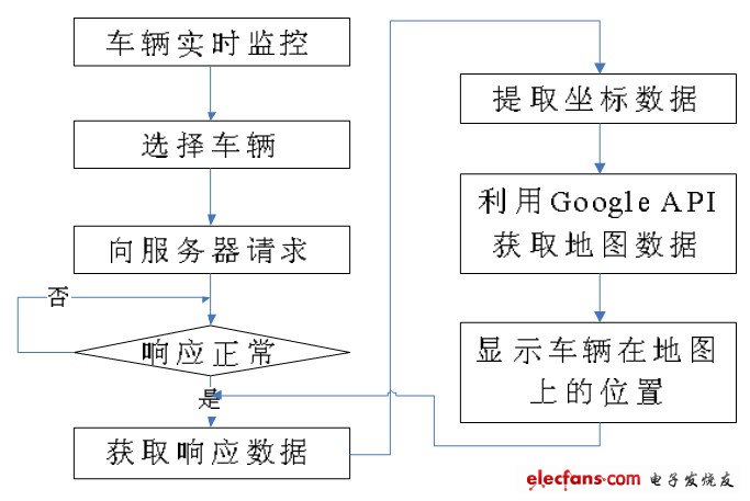 用户在电子地图上实时监控车辆位置。本系统是通过Android 上的Google API 插件调用地图服务器栅格图像数据给予地图显示。(见图2)用户希望实时的监控车辆,并把其车辆位置信息显示在地图之上。首先需要用户选择车辆,向服务器发起实时监控请求,中心服务器在接收到车载终端发回的定位信息后,就转发给监控端。得到定位信息后,通过Google API 插件获取当前位置的相关地图并呈现在用户面前。整个过程是中心服务器和Google 地图服务器协同工作的结果,高效的把分布式网络资源整合在一起。