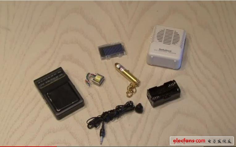 用激光器传播收音机信号,是发生变化的电信号具象化 准备材料:一个小型收音机,一块音频变压器,一根激光笔,一个喇叭,2根信号线 1. 放入3节AA电池,确保能提供4.5V 2. 将激光笔后盖打开,内柱和外壳分别与电池组地、正极连接好 3. 现在来试验一下激光器的性能,记住一定要对着别人的眼睛哦