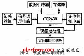 本设计选用的核心芯片是TI公司推出的ZigBee芯片CC2430。它以8051微处理器为内核,自身携带的射频收发器用来实现无线传感器网络节点的通信,提供了4路I/O口来控制传感器的打开和关闭。传感器将相应的环境数据变成电压、电流等信号送给信号调理电路,经相关调理后送到CC2430的 ADC接口进行A/D采样,最后CC2430将得到的A/D值存人1个外接的64 Kb的存储器中。当节点作为网络中的汇聚节点时,CC2430的 2路I/O口被设置成UART0串口Tx和Rx,用于和数据中转器进行串口通信。对于能源供应部分,为保证节点长期稳定工作,选用2300 mA的镍氢充电电池,2组镍氢电池采用双电源供电模式。软件通过控制2组镍氢电池的切换实现对节点的轮流供电,并在电池电压不足时控制太阳能电池板对其进行充电。