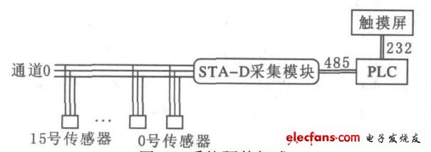 温度监控部分系统的硬件由DS18b20 型数字温度传感器、采集模块、FX2N 系列PLC、FX2N-485-BD、HITECH 触摸屏组成, 其结构如图1 所示。