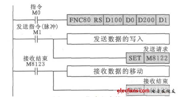 考虑到操作的方便性, 在系统初次安装时, 先在PC 机上用上位机软件将所有传感器的ID 搜索出来, 然后按实际安装位置给每个传感器编号, 读温度测试传感器是否工作正常。在PLC 上使用Mo dbus协议通信时首先要对通信格式进行设定, 即对D8120 寄存器进行写操作, 在本系统条件下设置为0C87 , 即数据长度为8 位, 无校验, 无起始位与停止位, 波特率9 600 bps。 修改D8120 设置后, 确保通断PLC 电源一次。 再用RS 指令进行数据的传输, 相关程序格式如图4 所示。