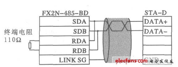 本系统采用的STA-D 温度采集模块, 是一种远程数字化温度采集系统, 有10 个通道, 每个通道最多可以挂接16 个DS18b20 型数字温度传感器,总共可以监控160 个点的温度, 以RS485 方式同上位机通讯, 通信协议为标准Modbus 协议, 波特率为9 600 bps, 与上位机通信距离最大为1 200 m, 工作电源为12 ~ 24 V, 工作温度为- 20 ~ 75 ℃。 与FX2N??485??BD 采用两线制的485 连线方式( 图2) ,接线要使用规范的屏蔽线。