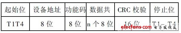 使用RTU 模式时, 消息发送至少要以3. 5 个字符时间的停顿间隔开始, 如图3 的T1- T 2- T 3- T 4 所示。 传输的第一个域是设备地址, 可以使用的传输字符是十六进制数值。 通信期间, 网络设备不断侦测网络总线, 包括停顿间隔时间内, 当第一个域( 地址域) 接收到, 每个设备都进行解码以判断是否发往自己的。 在最后一个传输字符之后, 至少要有3. 5 个字符时间的停顿以标定消息的结束, 之后可开始新的消息传输。典型的消息帧如图3 所示。 使用RT U 模式, 消息包括了一个基于CRC 方法的错误检测域. CRC 域检测了整个消息的内容。