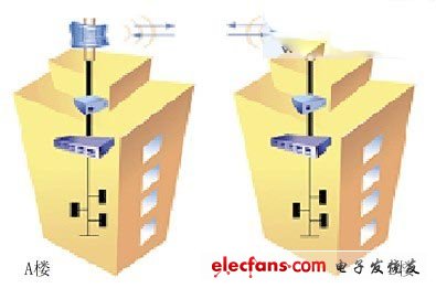 可采用点对点方式直接传输:A大楼放置一台无线网桥,顶部放置一面定向天线;B大楼同样放置一台无网桥,顶部放置一面定向天线。两地的无线网桥分别通过馈线与本地天线连接后,两点的无线通讯可迅速搭建起来。无线网桥分别通过超五类双绞线连接各地的网络交换机。这样两处的网络即可连为一体。