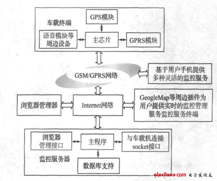 车辆监控管理系统包括服务器、监控服务终端、车载终端以及外围网页浏览器管理器和用户手机管理器。各个部分以服务器为中心, 通过GSM/ GPRS 网络以及Internet 网络组织起来配合工作, 完成车辆实时监控管理等功能。系统总体结构框图如图1 所示。
