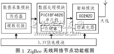 设计选用PIC18系列的单片机+CC2420解决方案,因此要创建ZigBee传感器节点必须具备以下组件:传感器设备,带SPI接口的PIC18F4620单片机,带有所需外部元件的CC2420RF收发器,天线(PCB引线天线或单极天线),3.3V稳压电源。整个硬件系统划分为数据采集、数据处理、射频和供电4个模块,如图1所示。