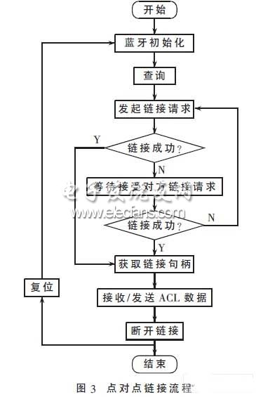 本系统设计的是蓝牙终端点对点的链接,其通信流程如图3所示。由图可知,蓝牙通信过程主要有蓝牙模块的初始化、查询、链接、数据通信和链接断开等几个过程。实现时,可以将蓝牙指令以函数的形式封装成一个HCI指令接口函数库。编写HCI驱动程序时,可直接从函数库中调用HCI指令函数,对蓝牙设备进行基本操作,如对蓝牙设备进行复位、读取蓝牙设备的地址、初始化、查询、建立链接、收发数据和断开链接等。