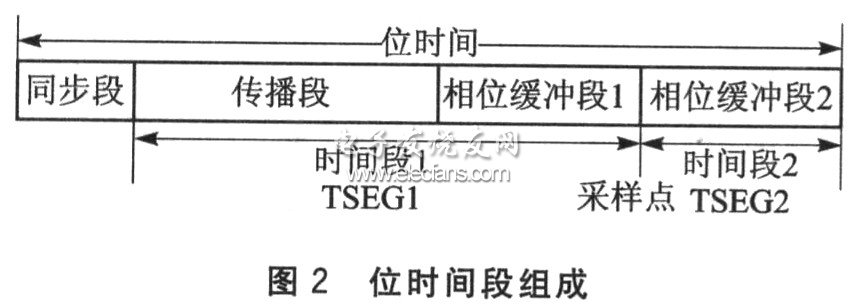 位时间内实现同步、网络延时补偿及采样点位置确定等总线管理功能,其段组成如图2所示。同步是相位缓冲段1加长或相位缓冲段2缩短,其上限为同步跳转带宽 (SJW)。采样点尽量位于(但不超过)位时间的7/8,能实现传播延迟和时钟误差最佳折中。时钟频率为16 MHz时,推荐分频因子=4、SJw=ltq、TSEGl=13tq、TSEG2=2tq(tq为时钟周期)。