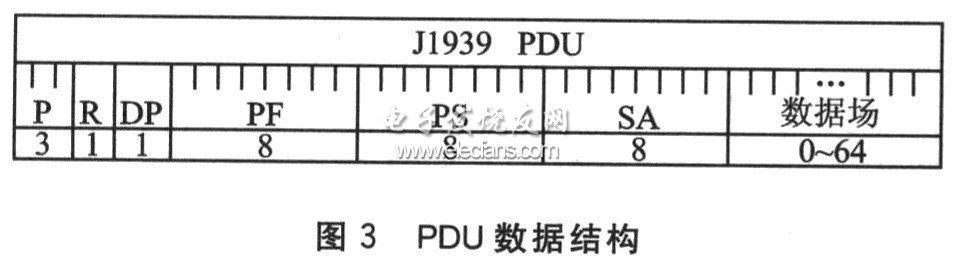 数据链路层通过协议数据单元(PDU)组织数据帧中的协议相关信息。PDU由数据帧中29位ID和O~8字节数据场组成,其数据结构如图3所示。P场决定报文优先级;R位保留;DP位是数据页位;PF场决定PDU格式(PDUl或PDU2);PS场为PDU细节,由PF场决定是目标地址DA还是对PF、的组扩展GE;SA为源地址。