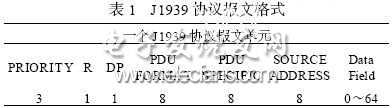 J1939 协议以CAN 2. 0B 为基础,是CAN 总线的应用层协议。J1939 协议将CAN 标识符划分为如下几个部分:优先级( P) 、数据页( PGN) 、协议数据单元( PDU) 格式、PDU 特定域(PS)和源地址(SA) .J1939/ 71 应用层文档定义了车辆控制的各种参数及命令的PGN.表1 为J1939 的报文格式。