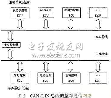 CAN 总线和L IN 总线相互独立,通过中央控制器实现资源共享并进行数据交换。中央控制器是整车管理系统的核心,它同时也是CAN 总线和L IN 总线的网关服务器,它的主要功能就是对各种信息进行分析处理并发出指令,协调汽车各控制单元及电器设备的工作。
