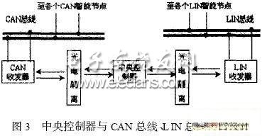 图3 为中央控制器与CAN 总线、L IN 总线接口设计。中央控制器内包括了一个CAN 的控制器和一个SCI 接口。CAN 智能节点一般由MCU ,CAN 控制器和CAN 收发器组成。
