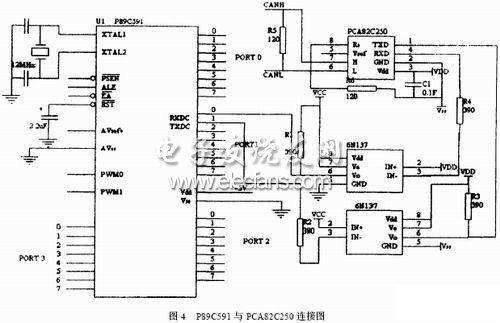 CAN 智能节点选择PHIL IPS 器件: PCA82C250 作为CAN 收发器; CAN 节点的MCU 选用P89C591 , 因P89C591 内部集成有CAN 控制器(有PeliCAN 接口) ,所以没有再选择CAN 控制器,其连接图如图4 所示。设计人员也可以选用微控制器+ 外接CAN 控制器这样的连接法。