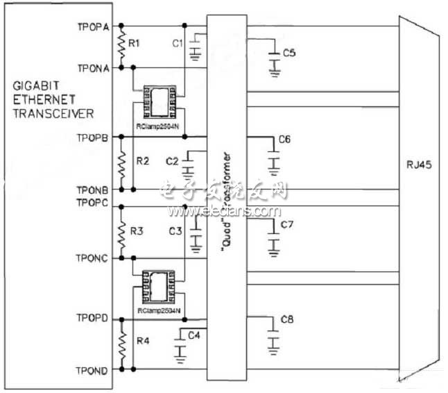 Semtech公司RClamp2504N/3304N被作为推荐的保护配置,是因为它提供了TVS的最低工作电压为2.5V或3.3V。低工作电压可以快速的瞬态响应时间,使低钳位保护电压敏感的物理层芯片。