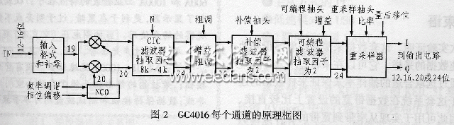 GC4016的原理框图和四个数字下变频通道中每一个通道的数字信号处理原理框图分别如图1和图2所示,
