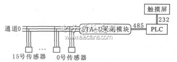 温度监控部分系统的硬件由DS18b20 型数字温度传感器、采集模块、FX2N 系列PLC、FX2N-485-BD、HITECH 触摸屏组成, 其结构如图1 所示。