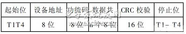 使用RTU 模式时, 消息发送至少要以3. 5 个字符时间的停顿间隔开始, 如图3 的T1- T 2- T 3- T 4 所示。 传输的第一个域是设备地址, 可以使用的传输字符是十六进制数值。 通信期间, 网络设备不断侦测网络总线, 包括停顿间隔时间内, 当第一个域( 地址域) 接收到, 每个设备都进行解码以判断是否发往自己的。 在最后一个传输字符之后, 至少要有3. 5 个字符时间的停顿以标定消息的结束, 之后可开始新的消息传输。典型的消息帧如图3 所示。 使用RT U 模式, 消息包括了一个基于CRC 方法的错误检测域. CRC 域检测了整个消息的内容。