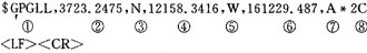 ①语句类型:$GPGLL;②纬度值;③北纬;④经度值;⑤西经;⑥UTC时间,时时分分秒秒.秒秒秒格式;⑦状态,A=定位,V=未定位;⑧校验和:2C。其中校验和包括$符。