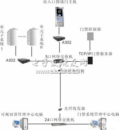 小区大概是个长方形状,而控制中心在整个小区的中央位置,所以以太网组网采用并联的方式:多个单元用一个我可视对讲服务器,它体积小(180MMX160MMX30MM)且自带IP地址, 标准的RJ45接口,每个可视对讲服务器旁边配置一个网络交换机,门禁系统每个单元也是采用的传统485加TCP/IP服务器的方式,对讲和门禁的服务器出来的都是标准的TCP/IP信号和RJ45接口,不存在兼容性和以往对讲和门禁相互干扰影响的问题,流量带宽也足够了。