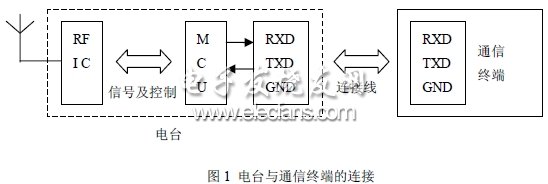 该电台采用单片射频集成电路及单片 MCU,外围电路少,电台与被控端和遥控端的连接如图1 所示。