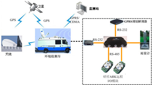 此监测系统相当于一套远程数据采集系统,它带有各种分析设备、GPRS连接和GPS,此外使用JMC-1102作为系统控制中心。JMC-1102通过他的两个RS-485端口连接两个研祥ARK模拟量输入模块,用来获取来自测量设备的监测数据。JMC-1102的数字量I/O通道直接连接雨量计用来测量降雨量。