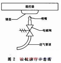 遥控器测试项目大都与按键操作有关,快速可靠地实现按键操作是该测试装置的关键。图2是按键操作示意图,进气管道连接到气泵,电磁阀控制气流的通断,当电磁阀打开时,气流冲击遥控器键盘,将按键按下,这样就能够用非接触方式对按键进行快速操作。