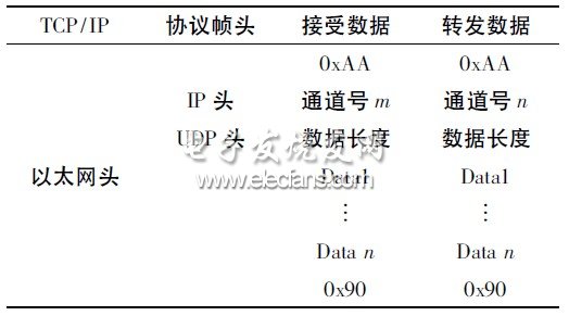 TCP/IP协议具有分层结构,能够实现对以太网数据帧进行打包和解包。UDP在TCP/IP的传输层,提供一种不可靠的数据传输服务,但UDP协议相对简单,比起TCP协议更能够提供实时和快速的数据传输。在正常的运行过程中,该TCP/IP程序模块能够从数据队列中获取串口通信的数据并将数据打包至UDP包中,然后将UDP包发送至IP层,最后形成一帧数据。该帧数据将会通过以太网发送到计算机中。与此同时,该程序模块还将从以太网接收到的数据解包出来,将其中的串口通道号和串口数据发送到SC28L198中去。表1描述了收发一帧数据的格式。