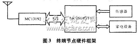 设备终端节点的功能是收发数据并执行控制命令,因此,设备节点对硬件平台的要求较低,本文采用的终端节点的中央处理器为Mc9so8G1'60,z唔Bee收发芯片仍为Mc13192。