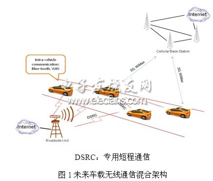 本文认为在不久的将来车载通信将建立于一种混合式的架构,如图1所示。在这种混合架构中,长距离通信技术,如蜂窝网络和WiMAX,能够为人们提供即时的互联网接入;而短距离通信技术,如DSRC、Wi-Fi(即802.11a/b/g),则能够为安全系统提供实时响应的保障以及为基于位置的信息服务提供有效支持。