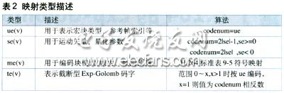 由式1可知,进行Exp-Golomb解码可先探测出码字前连续O的个数,再取出后缀,经该公式计算即可得到codenum值。在H.264中存在四种Exp-Golomb码:无符号型ue(v)、有符号型se(v)、映射型me(v)和截断型te(v)。因此,对于解出的codenum值,根据句法元素类型的不同有四种映射方式,如表2所示。根据相应描述完成映射后,输出syntax即为解码值。