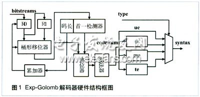 输入码流缓冲移位模块是实现H.264实时解码的关键模块。由于在每个变长解码流程中,码长不可能事先确定,所以在解出码值的同时必须定位下一个码字。这就要求该模块具有快速响应和并行输出的特点。由于H.264中定义Exp-Golomb码最大码长不超过32,设计中采用两个32位寄存器,一个32位桶形移位器及一个累加器的组合来实现该功能,如图1左端所示。其中,寄存器Rn负责从外部模块读取数据,并和寄存器R1一起作为桶形移位器的输入; 在每个解码周期,桶形移位器移出已解码流的同时还要装载新的待解码流;而累加器则计数已处理码长,传送桶形移位器移位长度,判断并控制R0的读取和R1的更新。这样就为后续处理单元提供了连续不间断的码流。
