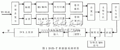 DVB-T调制器中COFDM调制系统是调制器中的主要部分,也是抗多径的OFDM技术在宽带无线通信中一个很好的利用。调制系统框图如图1所示。