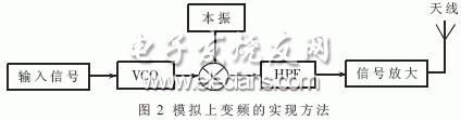 一般调制器的上变频可以采用模拟方式和数字方式两种方案,图2为一简单模拟上变频的实现电路,它的原理就是利用压控振荡器的振荡频率来实现调频。首先,输入信号经过VCO与本振信号混频后得到和频与差频信号;这些信号经过高通滤波器以后,滤除掉低频分量,高频分量就可以经过放大器传输到信道中去。由于模拟电路的一些固有缺陷,例如抗干扰能力较差,精度较低等,所以这种上变频实现方法的稳定性和可靠性都较差。