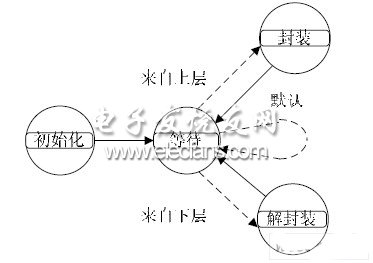 首先在INIT 态进行初始化设置,进入WAIT 态,然后根据不同的包流,对包进行封装或解封装。SCPS-NP 导头封装长度及格式,由用户在节点属性中进行选择。提供与空间分包协议类似的服务时,导头长度为4 字节,提供与IPv4 协议类似的服务时,导头长度为20 字节。