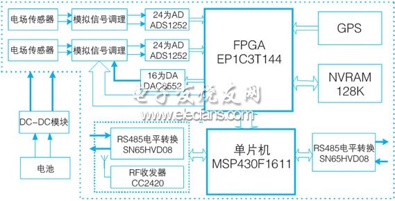 本系统主要由子站、基站和管理平台三部分组成。子站是一种嵌入式微处理器系统,用来完成各种电法测量的功能,如电阻率、激发极化电位ip(时域和频域)、可控源音频大地电磁csamt(标量、矢量、张量)等的测量,测量的参数主要有电场和磁场。子站采用msp430f1611作为微处理器,它是一款高性能的低功耗16为单片机,具有丰富的存储资源和接口,易于集成外围器件,子站作为无线传感器网络的节点,根据不同的测量功能布置在探测区域的各个测点上。采用高性能ieee802.15.4/zigbee兼容射频芯片cc2420作为无线收发模块,可以使设备与采用802.15.4标准的设备实现互连互通,可工作于2.4g 免授权频段,支持16个最大传输速率为250kbps 的信道;同时采用了dsss技术,具有极强的抗干扰性;内置收发射频开关,硬件mac加密(aes-128),支持数字rssi/lqi,与处理器的接口较为简单,在业界处于领先水平。子站的总体设计如图2所示。