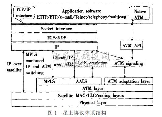 由图1 可以看出星上协议中ATM与IP 之间的关系。早期的宽带IP 卫星系统大多采用基于ATM的传输技术。但是一些研究人员认为IP over Satellite 方案与IP over ATM方案相比具有更大的好处:
