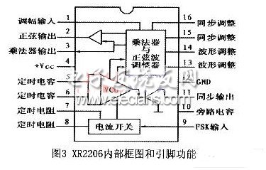 XR2206的工作特性:a.电压电源10~26V;b.频率温度稳定性20ppm/℃;c.频率扫描范围2000:1;d.振荡频率为0.01Hz~lMHz;e.正弦波失真度O.5%;f. FSK键控电平1.4V;g.正弦波输出阻抗600Ω;h.功耗≤750mW。