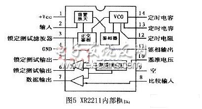 电缆定深器在设计过程中以XR221l为解调单元的核心芯片,它由一个预放大器、锁相环PLL、相位检波器、内部基准电压源和比较器等组成,使用其中的VCO鉴相器和外部环接滤波器组成基本的锁相环路,再和FSK比较器组成,就可实现FSK解调功能。其内部结构框图如图5所示。