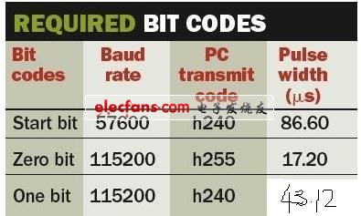 本方法的主图示使用RS-232波特率控制的内置时间。大多数通讯需要3个“位编码”:(起始位),数据(位0)和数据(位1)(见表和图2)。使用Visual Basic的mscomm将PC COM口配置成输出8个数据位,无奇偶校验位,1个停止位,无流量控制。COM口数据位的设置与波特率确定位码宽度。通过改变位之间的波特率,得到不同的脉宽编码。